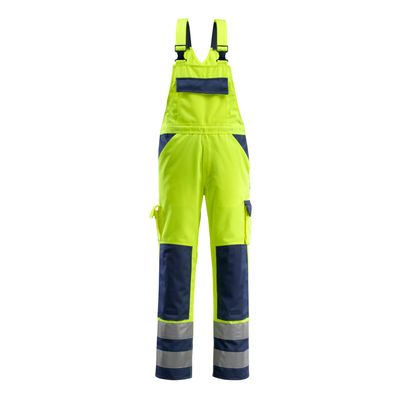 Mascot Barras | 7169-470 | 0171-hi-vis geel/marine Fluorescerend, met reflecties. Teflon® maakt het product vuilafstotend. Tweekleurig. Drievoudig gestikte naden aan de broekspijpen en in het kruis. Verstelbare schouderbanden met korte sterke elasti...
